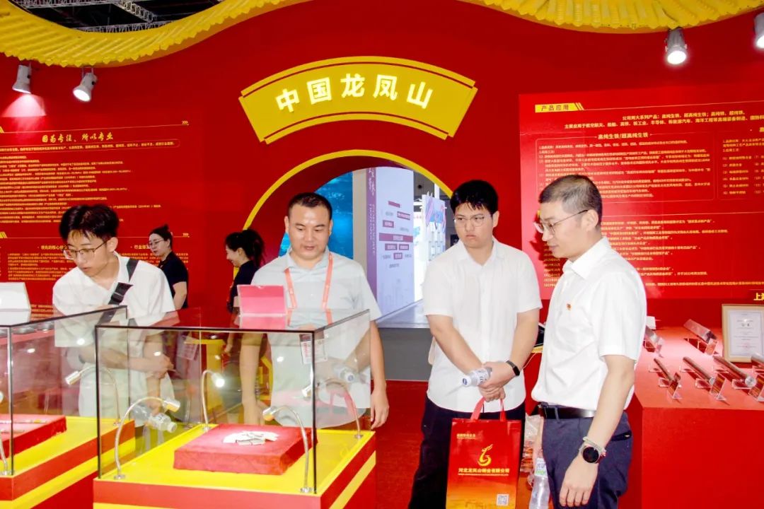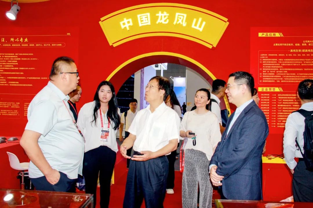 各级领导来关怀。开展以后,中国钢铁工业协会副会长夏农、中钢协材料应用推广中心副主任涛雅、中钢协规划发展部副主任李全功、冶金贸促会展览部高级总监仲文等领导,浙江省衢州市龙游县县委书记祝建东、龙游县副县长林峰等领导带领当地企业代表来到龙凤山展位进行指导和交流。公司市场运营服务部副部长孙学铭、大区总经理陈敬波等向协会领导介绍了公司的基本情况、高纯生铁/超高纯生铁,高纯铁/超纯铁两大系列铁基新材料的“三高品质”、应用领域以及科技创新等方面内容,得到了领导们的高度肯定和赞扬。