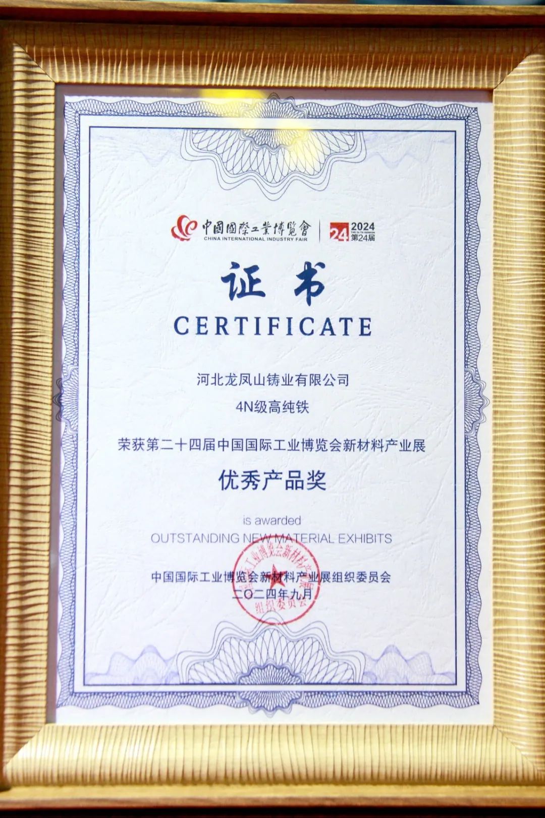 获得优秀产品奖。9月25日下午,在第24届中国国际工业博览会优秀新材料参展产品发布会上,我公司生产的4N级高纯铁荣获第二十四届中国国际工业博览会新材料展优秀产品奖,公司市场运营服务部副部长孙学铭上台领奖。