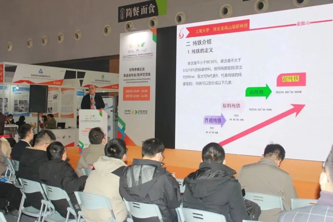 在优秀参展企业新品发布会/技术交流会上,公司技术中心主任李道明做了题为《以铁的高纯净化推动中国制造高质量发展》的学术报告,详细的阐述了纯铁的定义、纯铁的生产现状、4N级高纯铁产品特性,以及龙凤山纯铁系列产品、工艺装备、产品检测、科技创新和战略合作等内容,赢得了现场行业专家学者的一致肯定和赞扬。