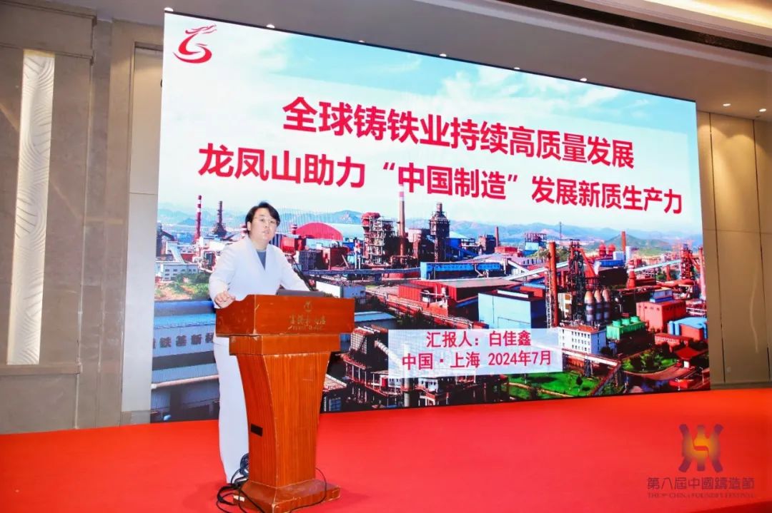 论坛报告,创新实践新材料。河北龙凤山作为本届年会的特别支持单位,公司副董事长刘武成和总经理白佳鑫应邀出席了开幕式。在7月3日上午开展的“先进铸铁技术分论坛”上,总经理白佳鑫做了题为《全球铸铁业持续高质量发展——龙凤山助力“中国制造”发展新质生产力》的报告。报告前半部分阐述了铸铁仍将是最主要的铸造材料,以及铸件轻量化趋势,列举了铸铁件在新兴行业的典型应用;后半部分详细介绍了龙凤山以生铁的“三高”品质助力“中国制造”培育发展新质生产力,从龙凤山独有的生产工艺及装备、保障生铁质量的主要过程控制措施(九条)、CNAS认可实验室建设情况、产品主要应用领域、创新发展4N-5N高纯铁/超纯铁等在铸造领域的应用进行了详细阐述。重点提到了以高纯铁/超纯铁为母材适量增碳、增硅可创新为纯净度更高的铸造用高端铁基新材料,并可根据用户个性化需求进行定制化生产。龙凤山铸造用铁基新材料的创新发展与实践,为高纯铁/超纯铁在铸造行业“高精尖”领域的应用打开了广阔空间。