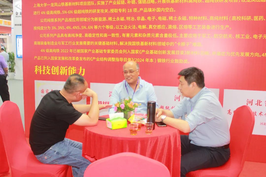 开展不久,上海有色网等媒体来到展位进行现场采访。公司市场运营服务部副部长孙学铭在接受采访时就高纯铁、超纯铁的生产工艺路线、研发团队、产品性能,以及纯铁新材料在新能源领域的应用等方面进行了详细介绍。同时表示,龙凤山将持续创新工艺、创新技术、创新产品,不断提升新质生产力,做精做强中国两大系列铁基新材料。